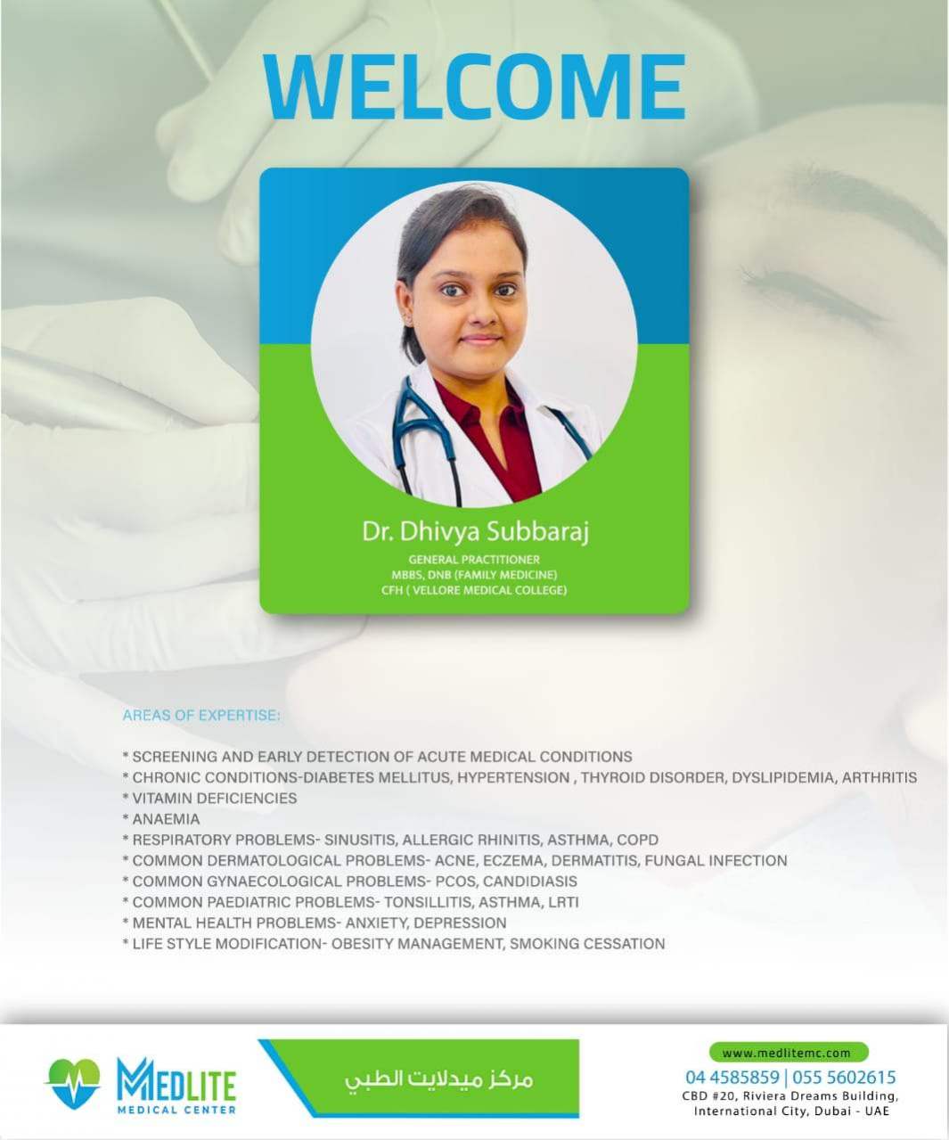 Medlite Medical Centre is based in Dubai and they provide services for general medicine, Dental and our own inhouse laboratory. Our Urgent care is highly monitored and well taken care of.